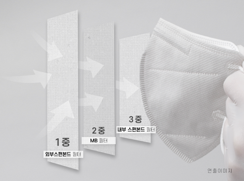 일방적인 섬유로 만드는 마스크는 작은 입자를 충분히 걸러내기 어렵습니다. 또한 필터가 너무 촘촘하면 호흡이 불편해지는 문제가 발생합니다. ABC 마스크는 이러한 문제를 해결하기 위해 멜트브라운 필터를 적용하였습니다. 멜트브라운 필터를 적용하기 위하여 폴리프로필렌을 고온에서 녹여 초미세 섬유망을 형성하여 머리카락보다 훨씬 가는 미세 섬유 구조로 초 미세 오염입자를 걸러내고 있습니다.