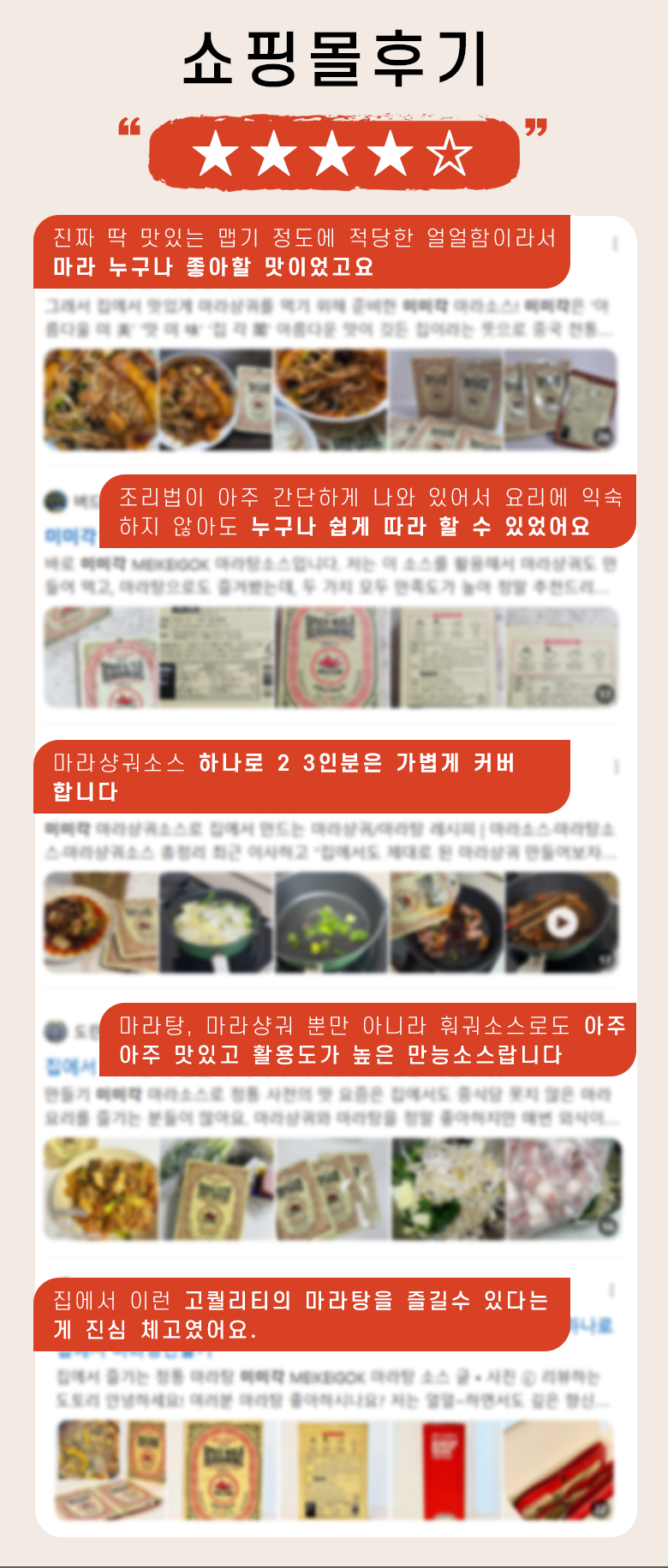 집에서 마라샹궈를 만들면 전문점과 같은 깊은 맛이 잘 나오지 않습니다. 얼얼한 매운맛과 불향, 감칠맛이 부족해 만족도가 떨어지고, 조리 과정에서 맛의 균형을 잡기가 쉽지 않습니다. 마라샹궈의 핵심은 다양한 향신료와 기름, 발효 소스가 만들어내는 복합적인 풍미인데, 이를 가정에서 정확한 비율로 맞추는 것이 어렵기 때문입니다. 후추·쿠민·회향·계피 등 여러 향신료는 향의 방향성이 달라 균형을 맞추기 어렵고 훠궈두반장과 고추기름 같은 베이스도 조합이 까다롭습니다. 이 때문에 충분한 재료를 갖고 있어도 맛의 깊이가 일정하게 나오지 않습니다. 미미각의 마라샹궈 소스는 이러한 문제를 해결하기 위해 만들어진 완성형 볶음 베이스다. 대두유, 고추, 생강, 마늘, 대파 등 기본 풍미 재료를 중심으로 20여 가지 향신료가 조화롭게 배합되어 있어 정통 마라의 얼얼함과 매운맛이 자연스럽게 표현하였습니다. 발효 대두 기반의 훠궈두반장이 깊은 감칠맛을 더하고, 고추기름과 향미증진 성분이 중식 특유의 묵직한 풍미를 완성해 재료만 넣고 볶아도 전문점과 가까운 맛을 쉽게 구현할 수 있습니다. 집에서도 중식당 수준의 마라샹궈를 만들고 싶은 사람에게 추천드립니다.